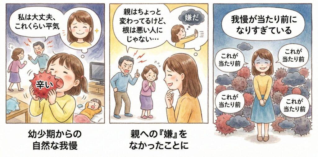 それは、幼い頃からあまりに自然に「感情を我慢させられてきたから」です。