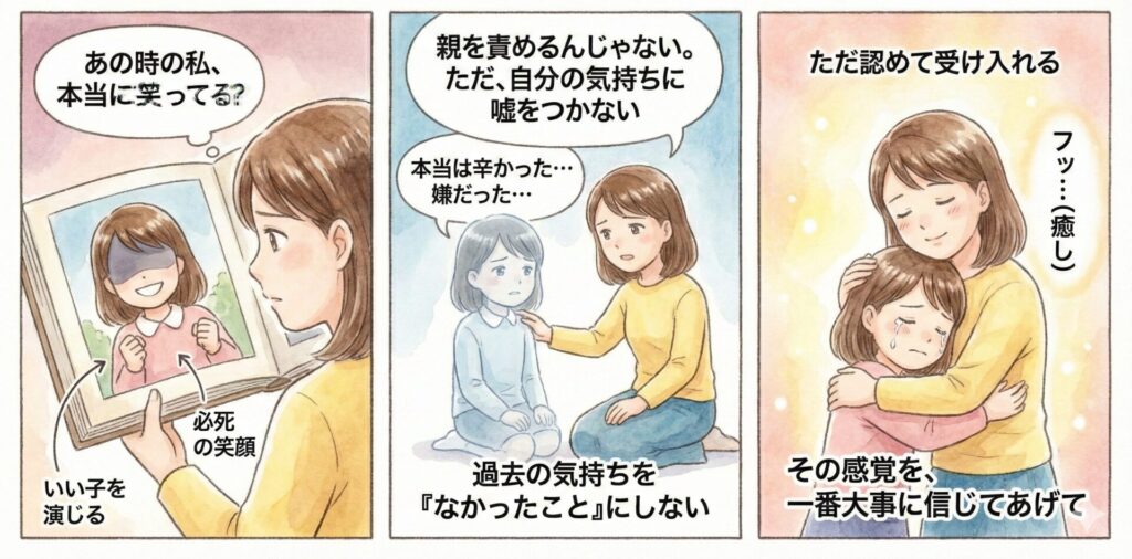 子どもの頃に抑え込むしかなかったその気持ちを、大人になったあなたが「なかったこと」にせず、ただ受け止めてあげてください。
