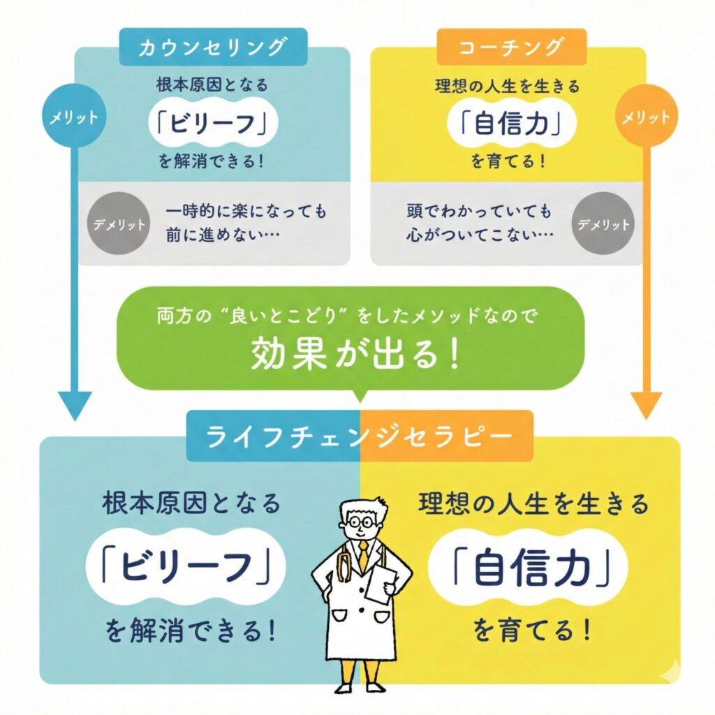 そのため、『ライフチェンジセラピー』では、「カウンセリング(癒やし)」と「コーチング(自己実現)」の両方のアプローチを取り入れています。
